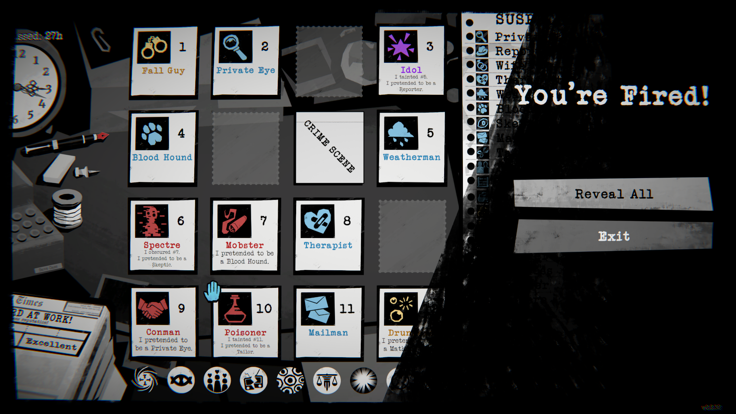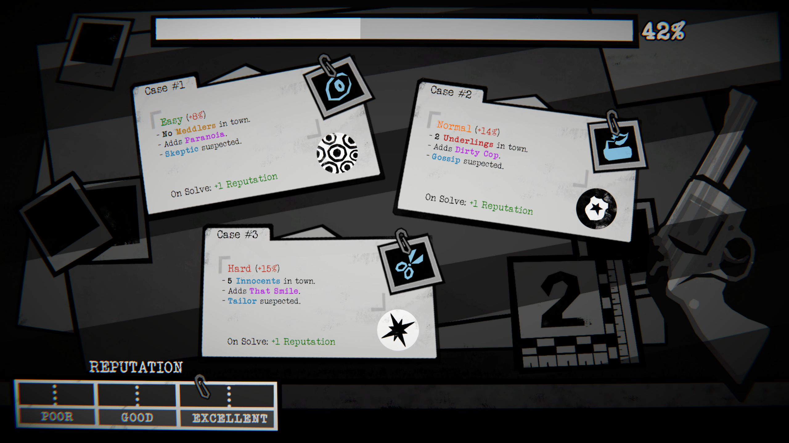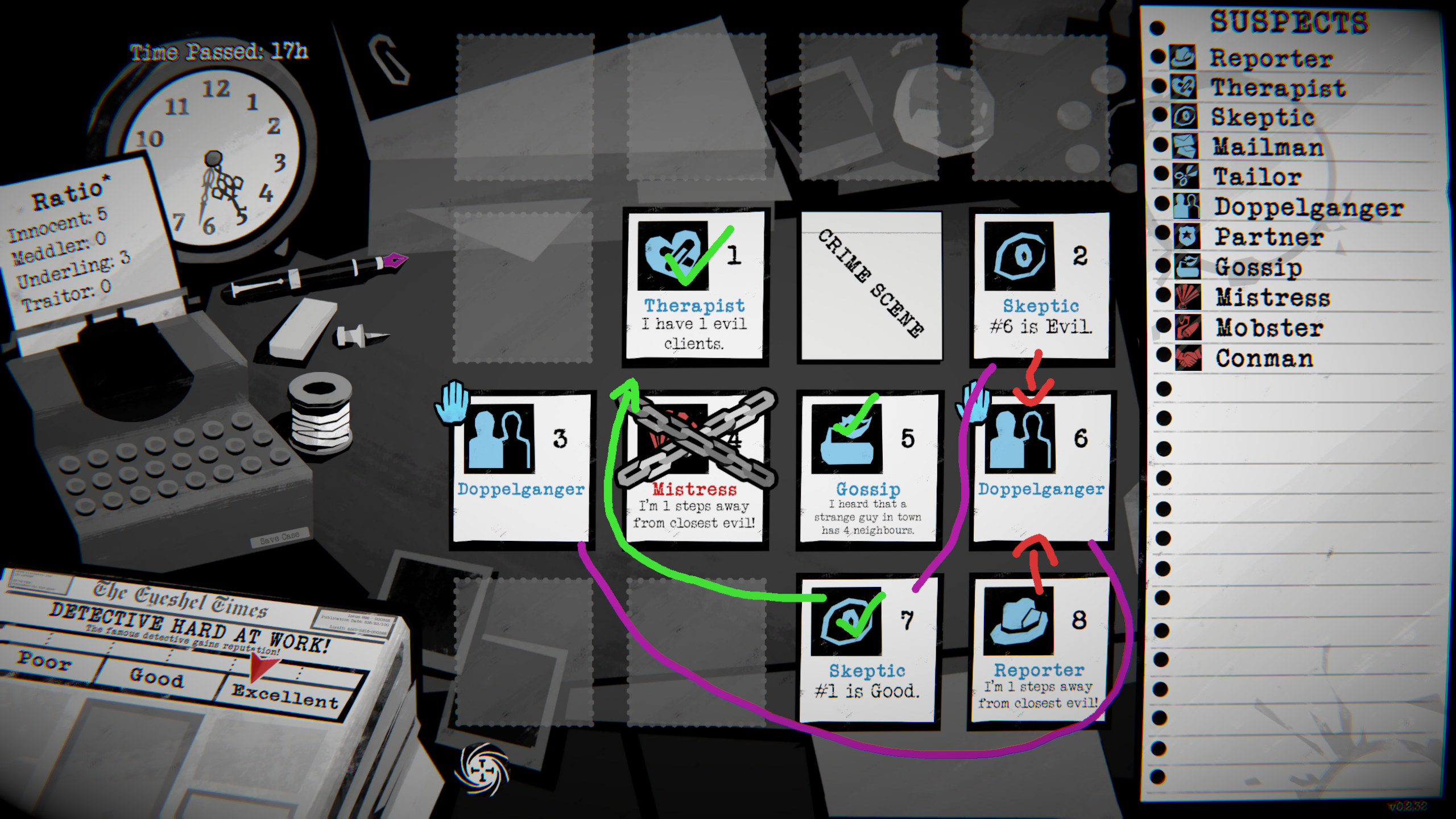 A terrible syndicate has infiltrated society, explore cases, listen to what the citizens have to say, and use that information to route out the good from the evil in this roguelike 'clock-like' deduction game. Can you uncover the head of the syndicate? Or will you be duped like the rest?